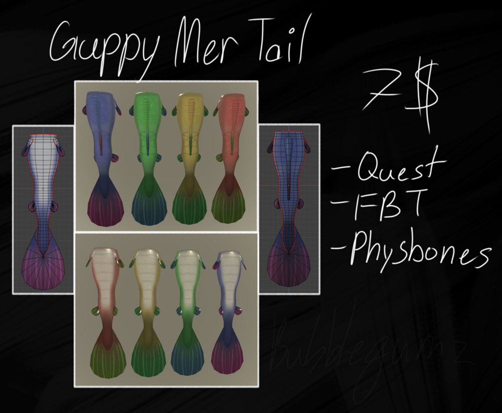 100% from scratch lil guppy tail. Has the FBT prefab option for those who want it + Instructions on how to install. This tail is Quest compatible with the material options of Standard Lte.