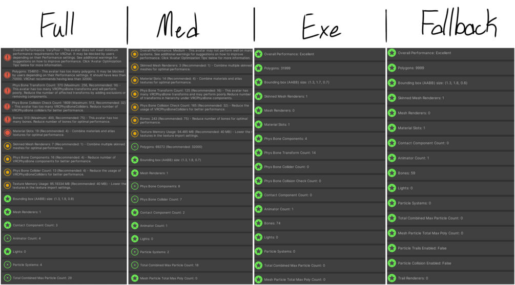 Here's all the toggles per performance level (sorry for the paragraphs lol):